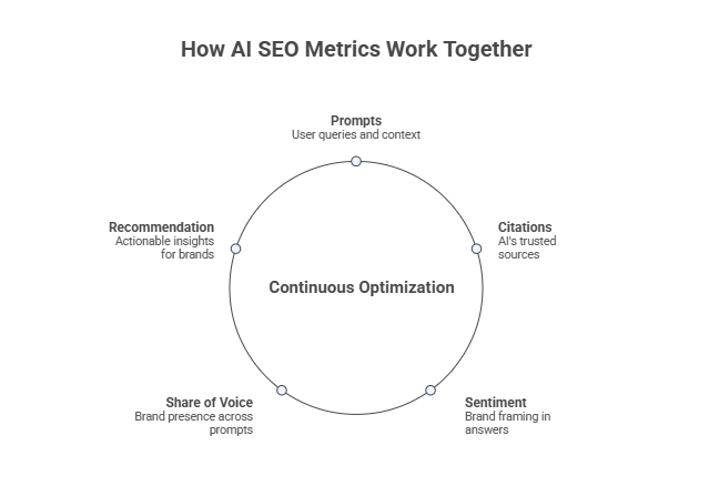 Crucially, these AI SEO signals operate alongside traditional SEO metrics like backlinks, keyword ranks, and click-through rates. A robust visibility strategy must consider both.