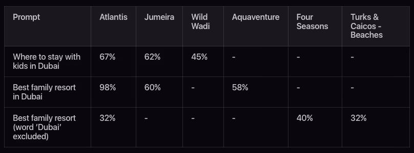 Here’s a quick analysis we conducted using family-focused hotel prompts for the Dubai market. The three prompts differ slightly in wording, with the last one tested without specifying the region.