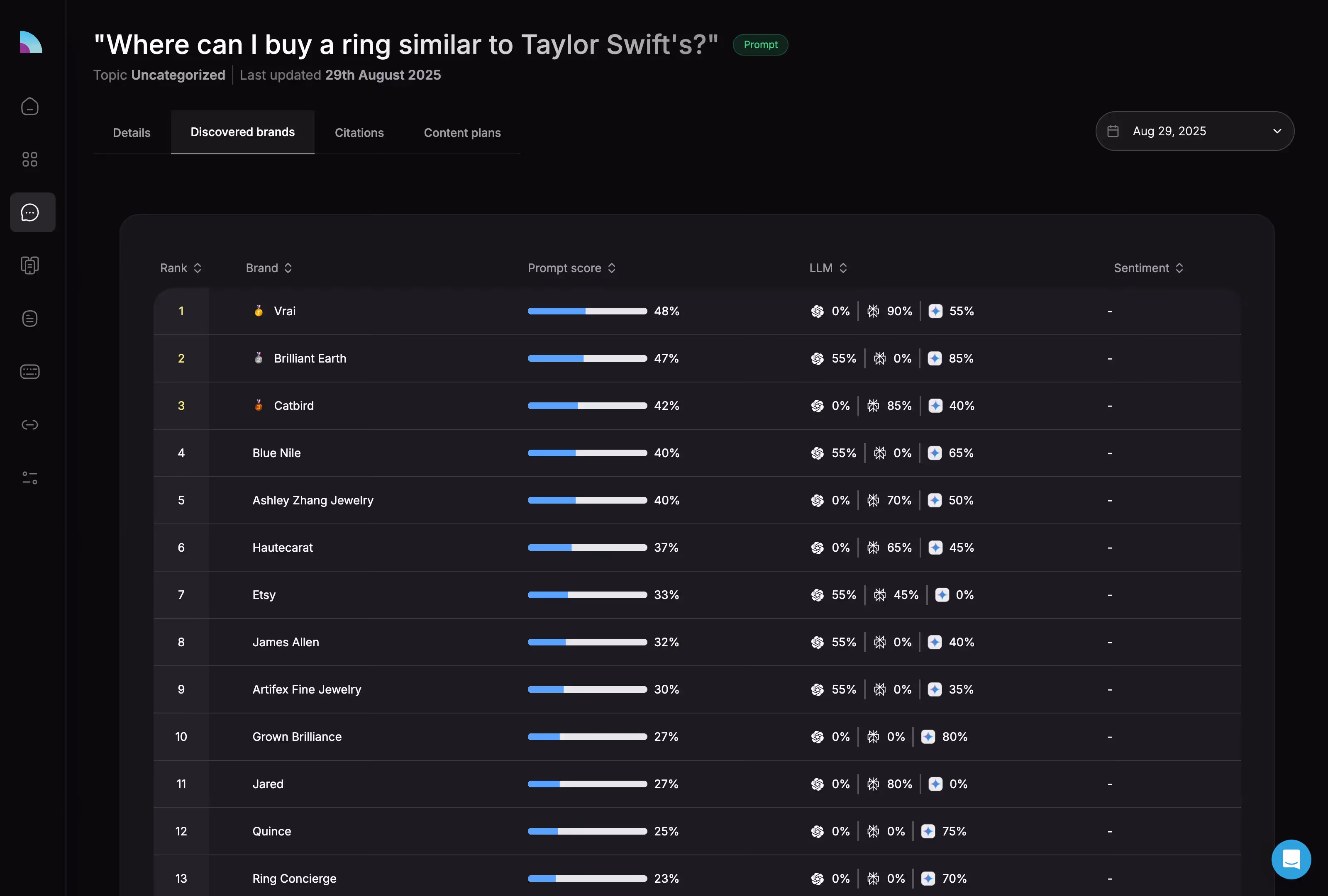 Ask an LLM “Which brands are known for designing iconic engagement rings?” and you’ll get exactly what you expect. Tiffany & Co., Cartier, Harry Winston, Graff, De Beers. These houses have defined cultural moments for over a century.