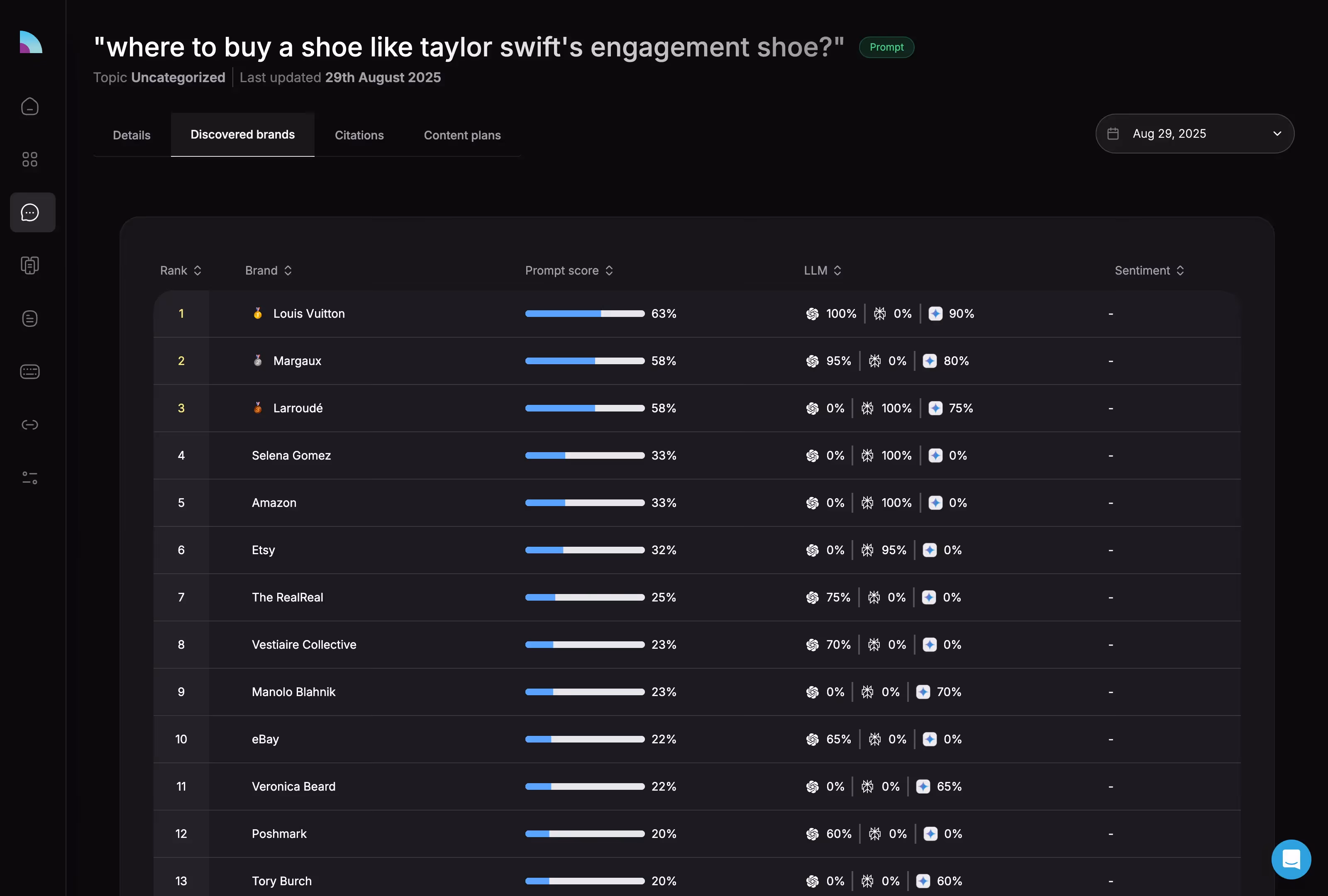 But shift the context to “Where to buy a shoe like Taylor Swift’s engagement shoe?” and things get strange. Yes, Louis Vuitton appears. But so do Margaux and Larroudé, boutique names most people haven’t heard of. Even more shocking: Amazon, Etsy, The RealReal, and Nike.