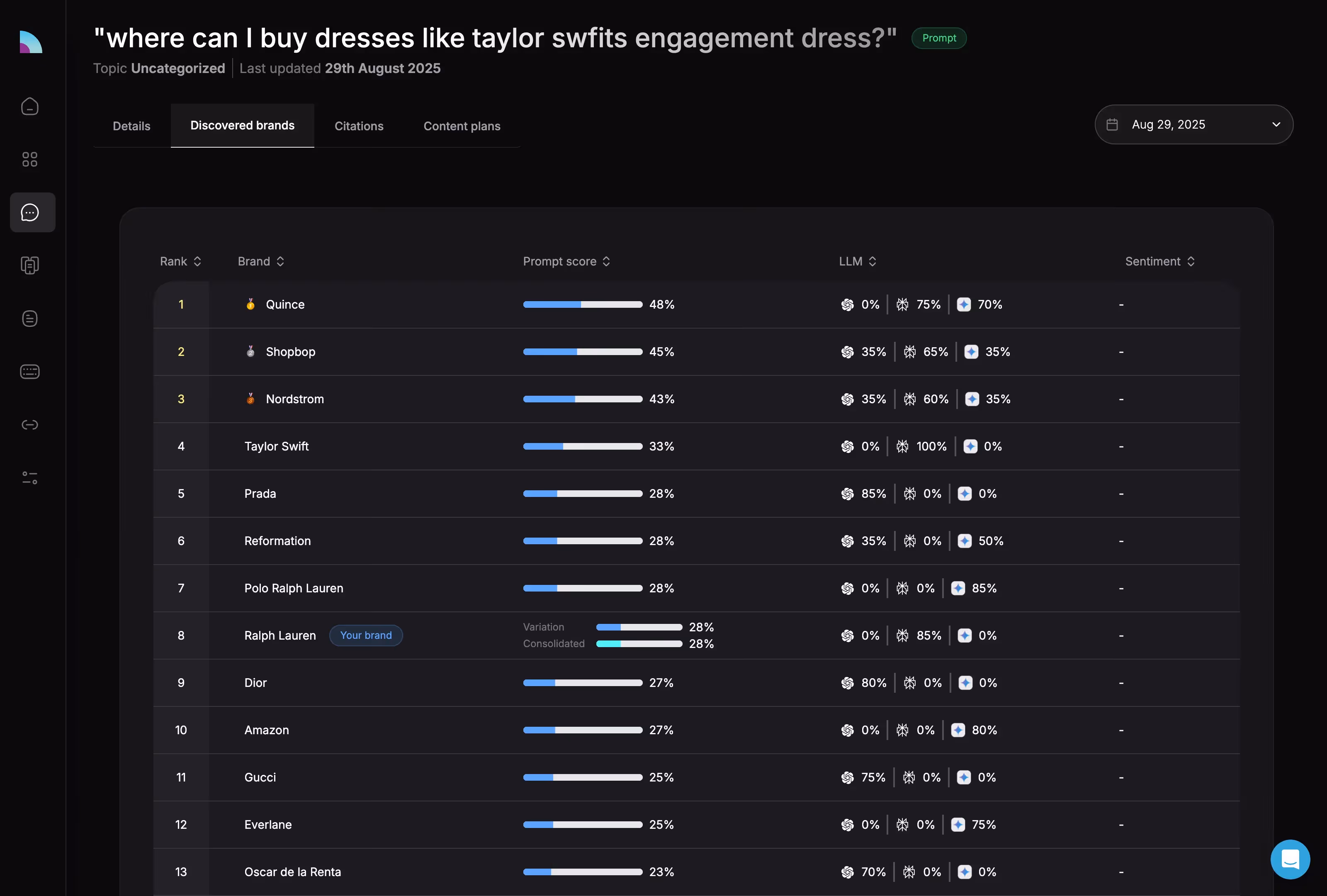 But change the frame to “Where can I buy dresses like Taylor Swift’s engagement dress?” and the hierarchy collapses. The leaders weren’t Dior or Chanel. They were Quince, Shopbop, and Nordstrom — shoppable platforms that optimize for breadth and availability.