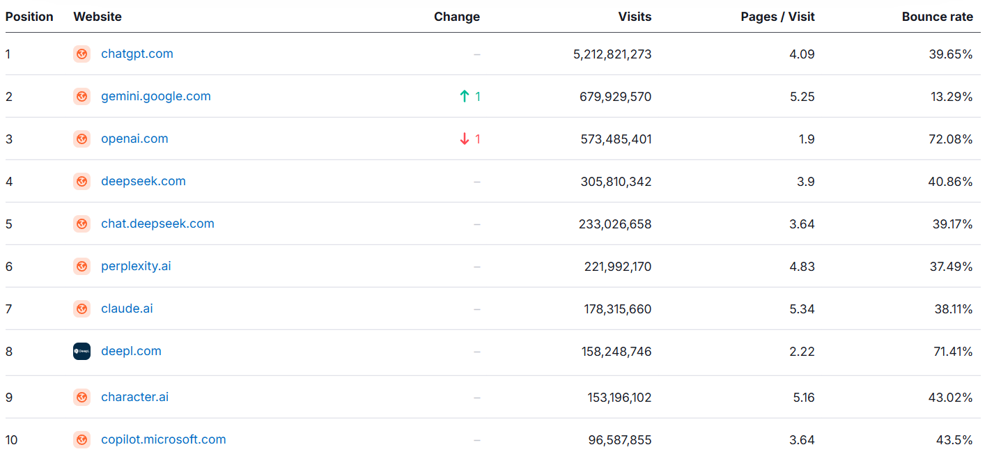 By December 2025, ChatGPT had clearly pulled ahead as the world’s most-visited AI platform, drawing around 5.21 billion visits a month. By comparison, Gemini sees roughly 680 million monthly visits, while OpenAI’s main site attracts about 573 million.
